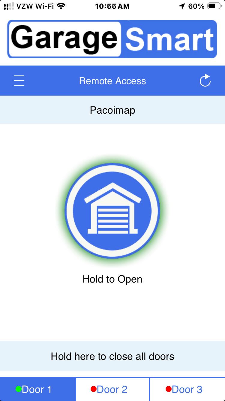 16. In the commercial view selected in step 11 you will have this screen and the door status will be red around the button. if not sowing, click "refresh" on top right.